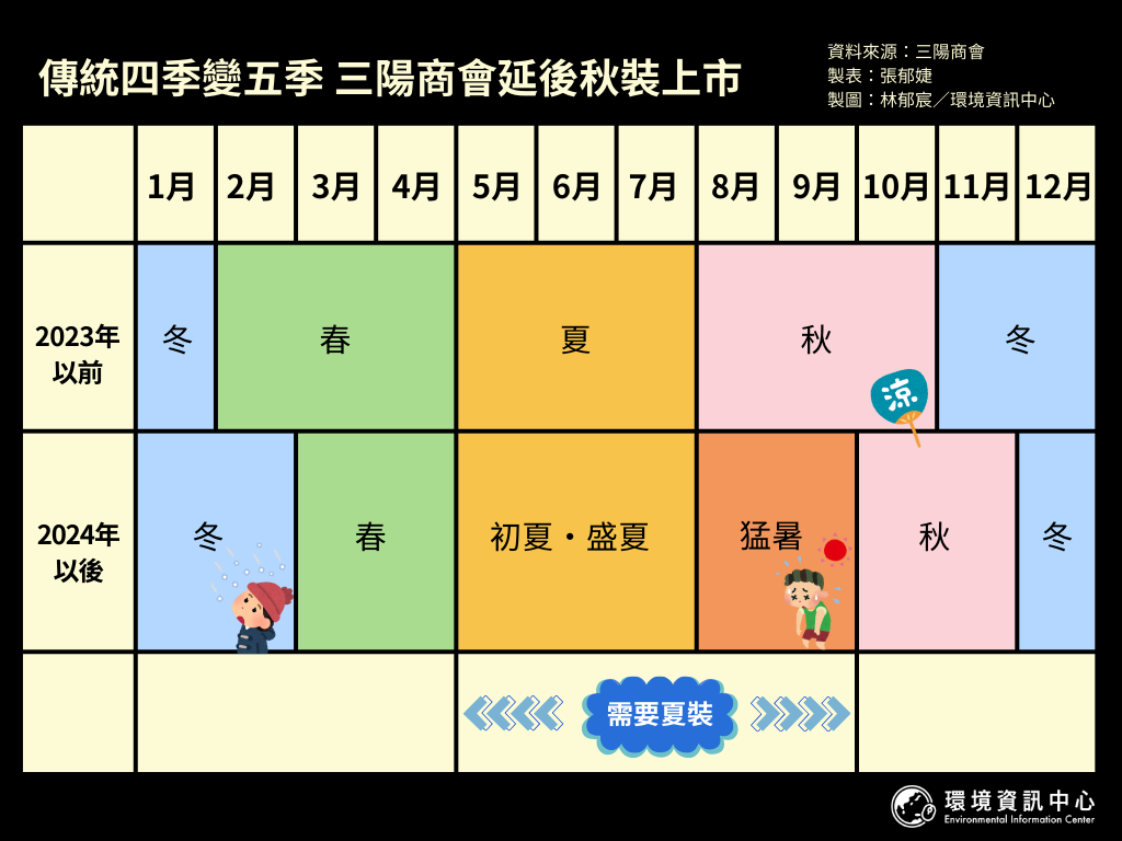 氣候變遷的影響下,夏天變得更長、更熱,在8月還是「猛暑」的情況下上架秋裝,明顯不合消費者需求。「猛暑日」意指當日最高氣溫超過35℃,民眾需要留意中暑,今年8月,東京都的猛暑日就達到18天,更一度連續10天出現「猛暑日」,刷新最長連續紀錄。因此,日本服飾業者三陽商會率先在2024年提出一年五季的概念,立刻引發關注。