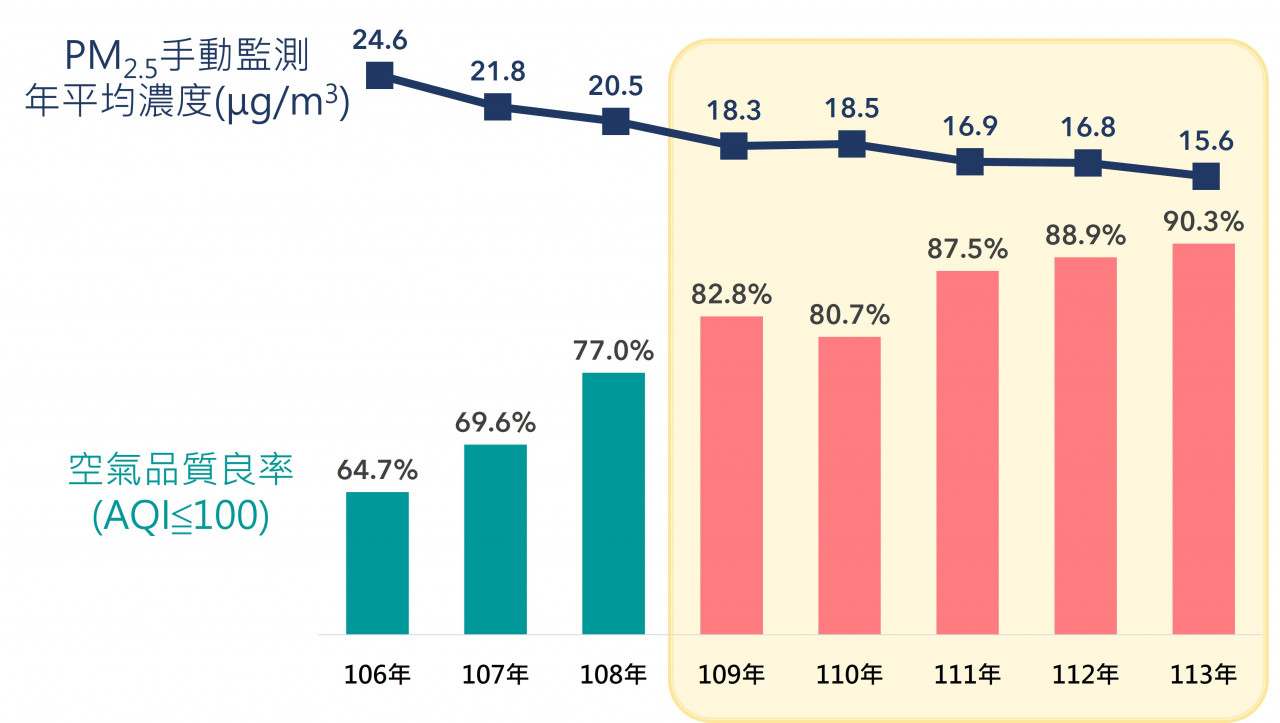 高雄市環保局長張瑞琿指出,106年,高雄的PM2.5年平均濃度仍高達24.6μg/m³(微克/立方公尺),遠高於世界衛生組織建議標準。經過多年持續推動與執行,至113年PM2.5年均濃度已降至15.6μg/m³,相較7年前下降約3成,顯示政策帶來明顯成效。