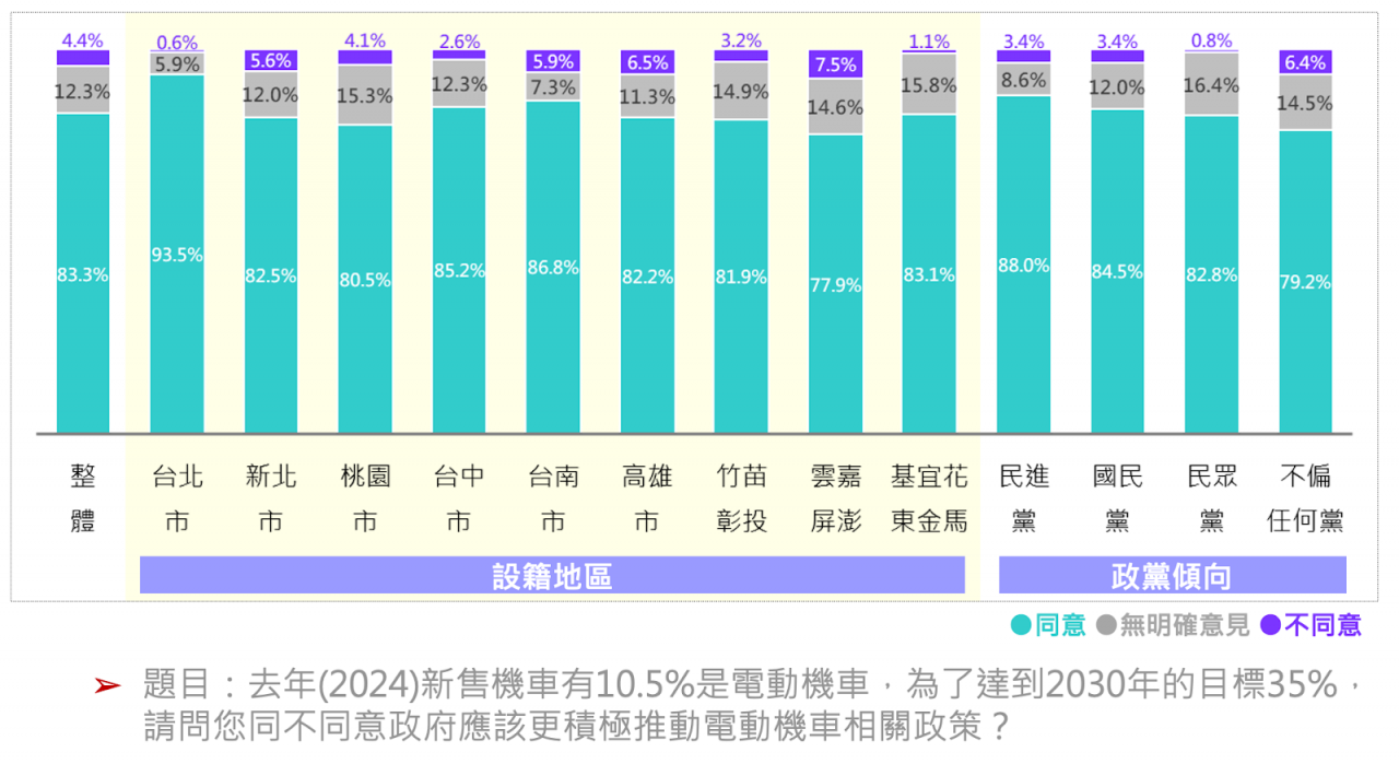 《電動機車政策 2025 民意大調查》結果顯示,高達 83.3% 的民眾呼籲希望中央政府更積極推動運具電動化政策。圖片來源:台灣智慧移動產業協會