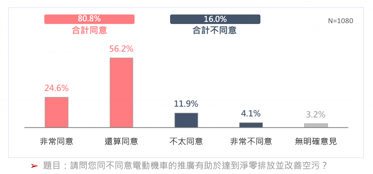 政府已將運具電動化訂為台灣邁向 2050 年淨零排放的關鍵戰略之一,本次民調顯示,高達 80.8% 民眾都認同推廣電動機車有助於淨零與改善空污,顯示社會各界普遍支持運具電動化要持續推進。