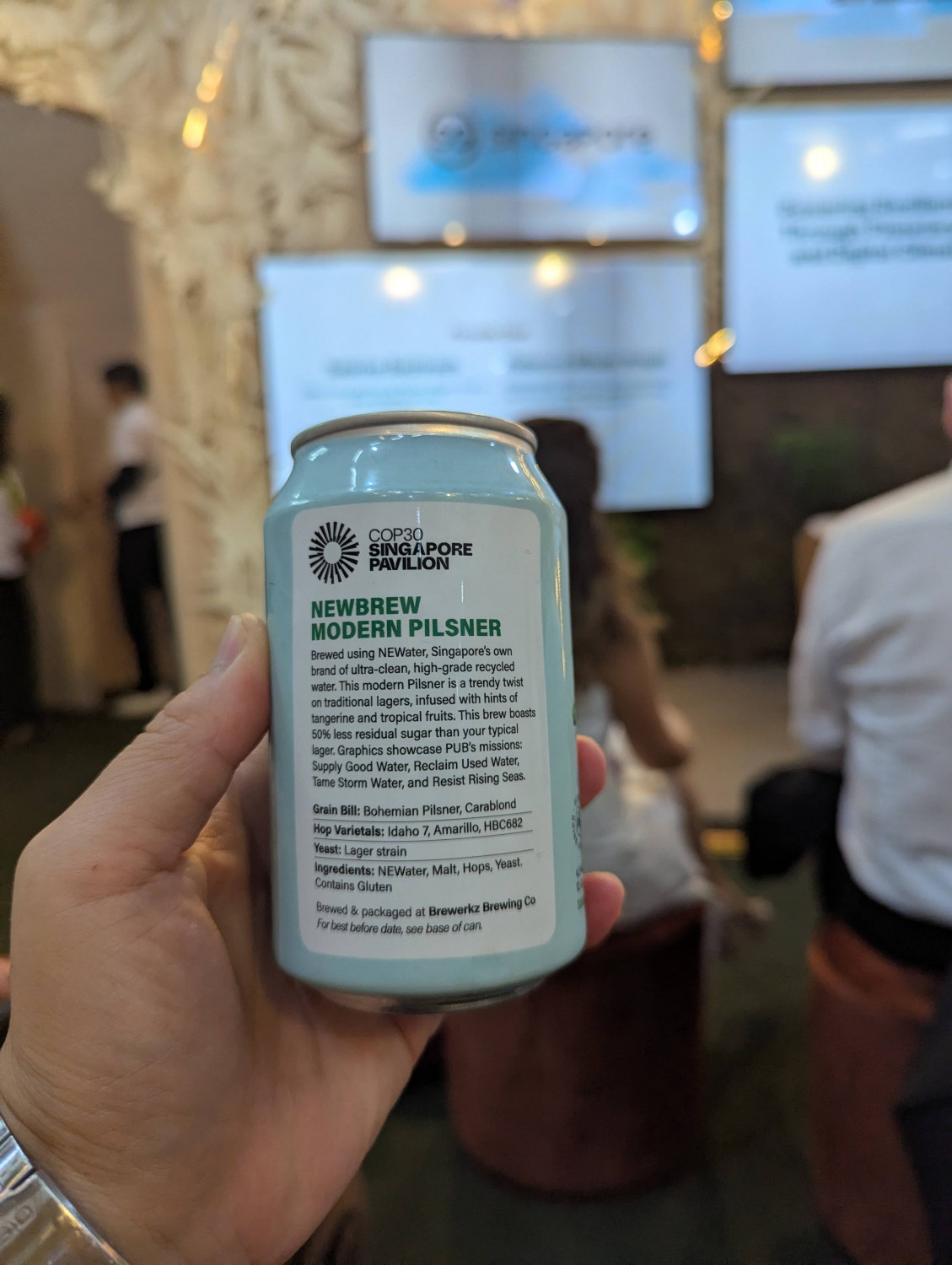 不過,仔細看了瓶身後的成分說明才知道,這款嘗起來清快爽口的飲料,水的來源,竟然是新加坡的特產「新生水」(new water),新加坡的新生水其實就等於是台灣的回收水,「換句話說,我們是在喝『餿水』做的啤酒?」參加COP30的台灣代表王俊儒開玩笑的說。