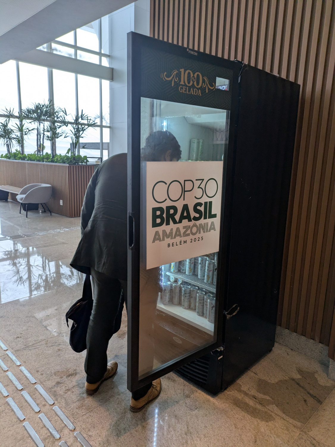 COP30免費提供「曼巴水」讓官方藍區(blue zone)的與會者隨時取用。 圖片來源:王之杰攝