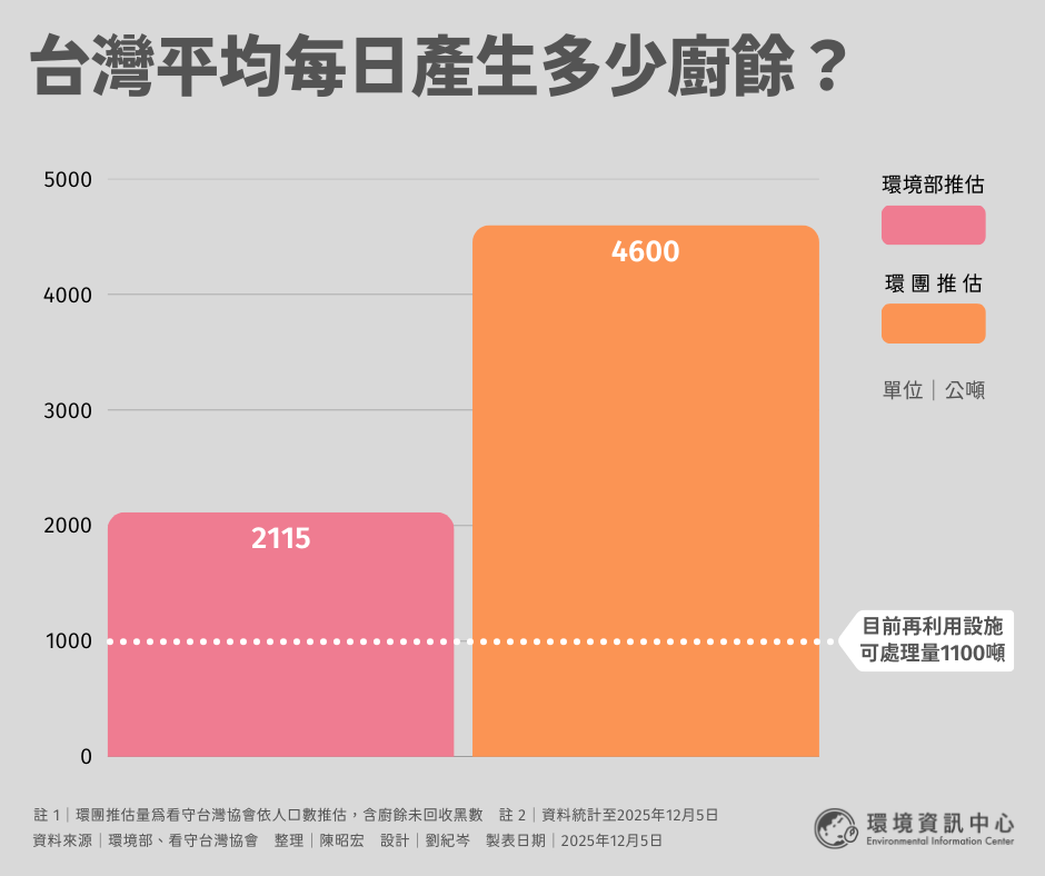 不過,謝和霖指出,看守台灣協會以台北市垃圾採樣分析資料,每人每日廚餘產生量0.2公斤計算,推估全台約2300萬人每日產生4600噸廚餘,並非環境部推估的每日平均2115噸。即便是目前路徑圖中的2029年再利用設施量能,也不夠處理。