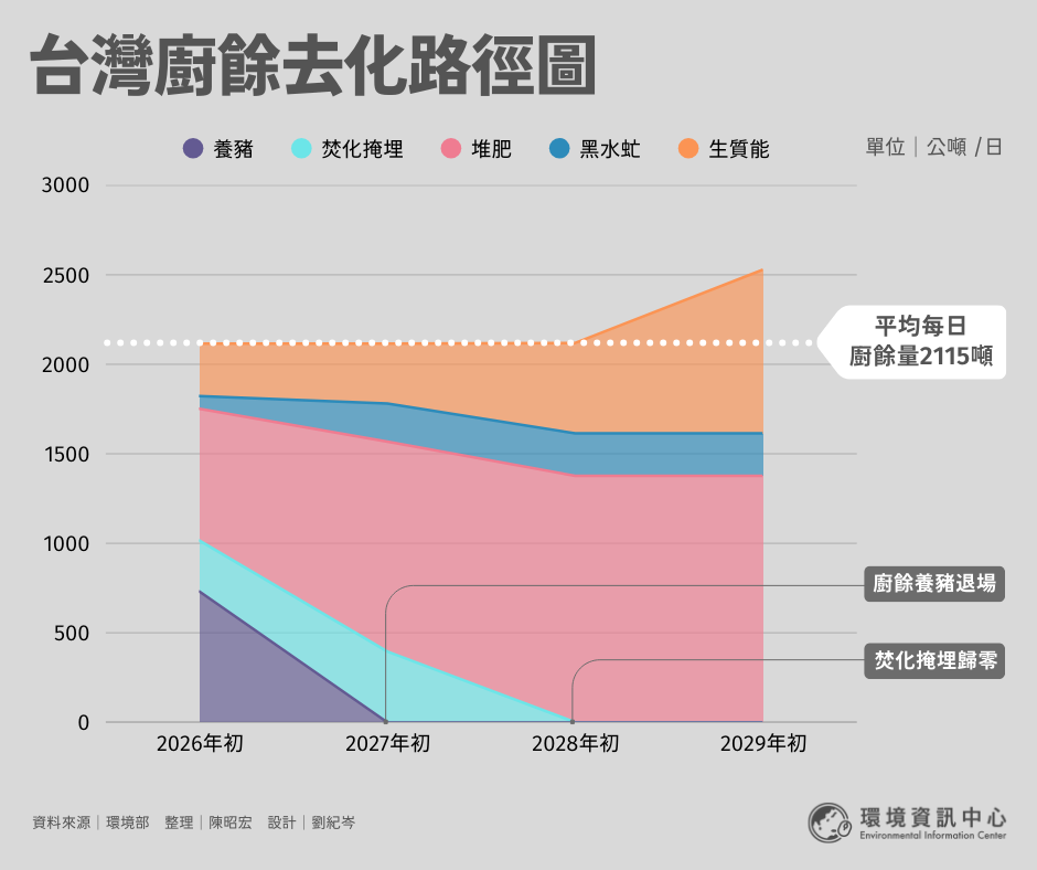 廚餘去化主力為何「押寶」堆肥及生質能?沈志修解釋,堆肥本就是廚餘再利用較常選擇的方式之一,若能控管味道,民眾反彈不大;生質能則是未來趨勢,台南、高雄、南投已經在規劃或招標生質能廠。他進一步解釋,垃圾處理是地方自治範圍,估算量能也是依地方回報的設施計畫,逐步堆疊統計出來。