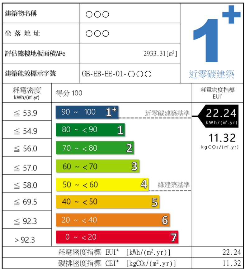 註:「建築能效標示」是針對建築物在實際使用階段的能源效率進行評估,綜合空調、照明與設備用電表現,由高至低依序分為第1至7級,其中屬第1級之建築物,且能效評分尺度為前百分之五十者,為近零碳建築(Nearly Zero-Carbon Buildings),以第1+級標示。