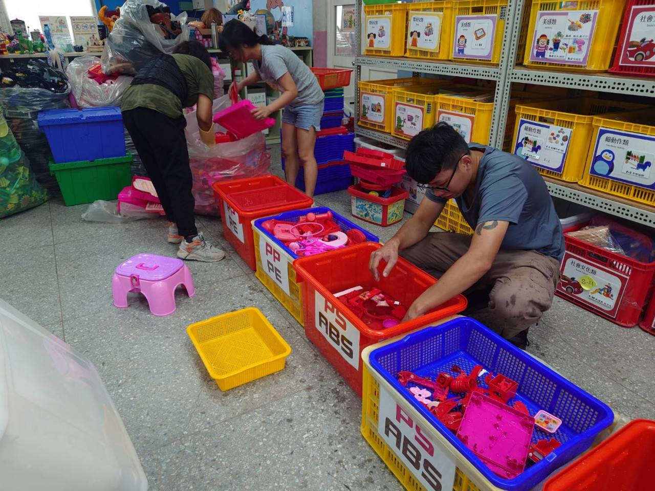 綠腳印專門處理臺灣玩具圖書館中無法修復的30%廢棄玩具,每年處理高達30噸。這些玩具多為複合材質,包含主機板、電池、輪軸等複雜組件,需要經過純手工拆解、分類、清洗。鄒文博解釋,一年需要2.7萬名志工投入。拆解後的金屬與電子零件由合作廠商回收,塑膠則透過「水分法」按比重分類。為確保再生品質,團隊還需要將顏色仔細分離,因為混色再生產品只能做成黑色,對孩子缺乏吸引力。