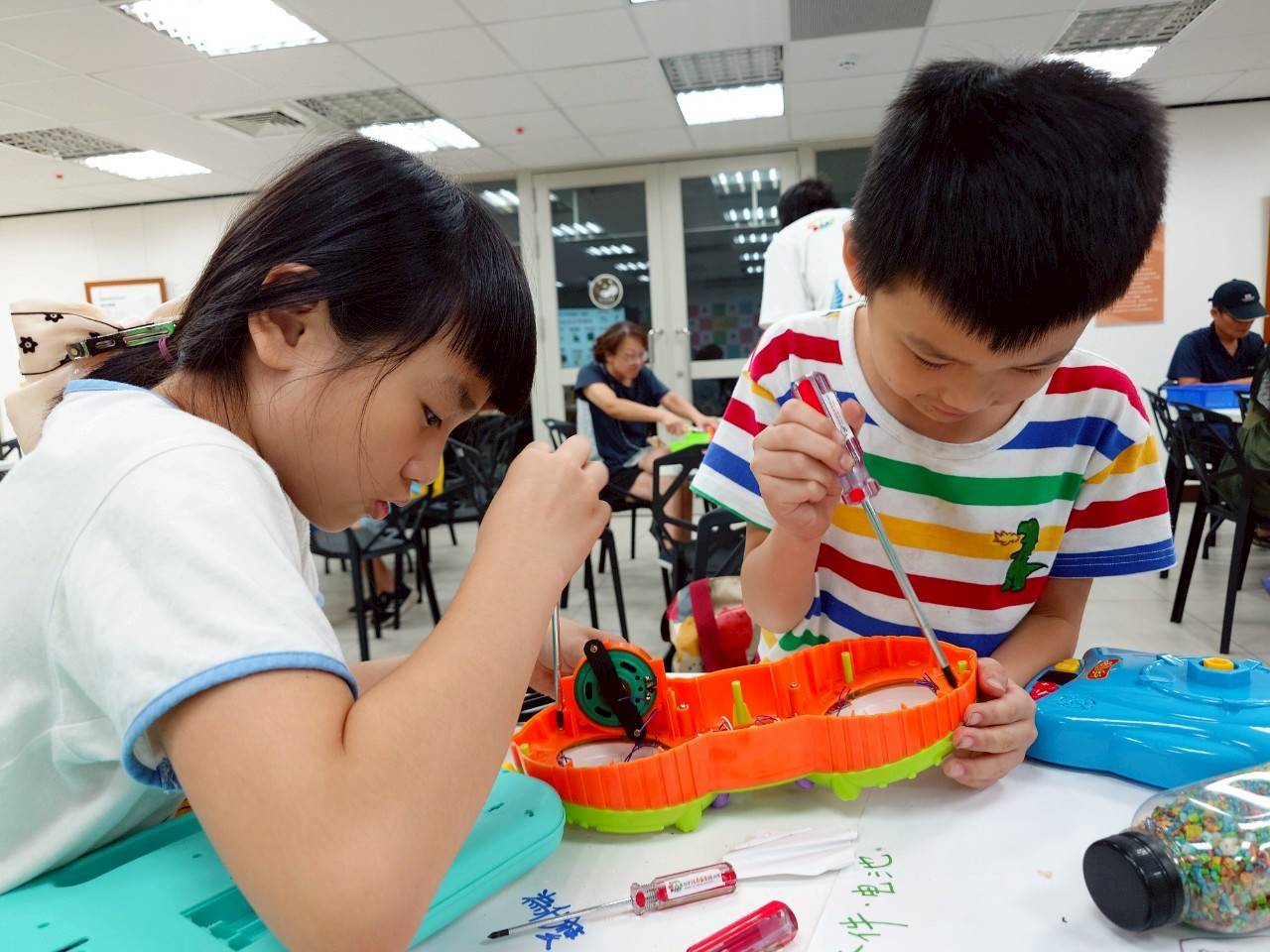 綠腳印還設計了一系列創意課程,讓孩子從玩樂中自然學習環保觀念。「玩具拆解課」讓孩子們用各種工具盡情拆解廢棄玩具,在過程中理解產品結構與材質特性。鄒文博笑著說,原本在家拆玩具會被責罵,在這裡卻能獲得「好棒」的鼓勵,就連爸爸媽媽都一起投入拆玩具。