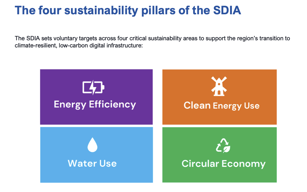SDIA簽署方承諾於2030年底前,在亞太地區的營運中實現100%無碳及再生能源覆蓋,涵蓋太陽能、風能、水力及核能,並依循溫室氣體盤查議定書(GHG Protocol)範疇二指引定義。協議明確指出,進度取決於3項條件:跨境電力交易的發展、當地綠電憑證(REC)的可及性,以及承認國際REC的監管框架。