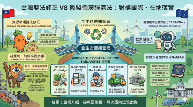 「資源循環推動法」修正草案方面,為接軌國際循環經濟,將更名為「資源循環推動法」,修法精神在於擴大管理範疇至產品全生命週期,從設計、生產、使用到回收再利用,全面納入資源循環管理。
