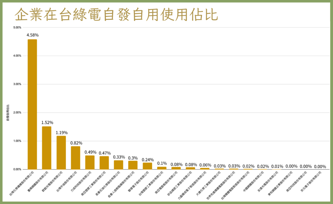 接著TRENA再根據2024年永續報告書、問卷調查方式,了解企業的總用電與綠電使用比例。根據企業在台綠電自發自用占比調查,台灣化學纖維以4.58%位居榜首,接著是豐興鋼鐵、群創光電、台灣中油;外購企業前3名則為台積電、華邦電子與南亞科技。