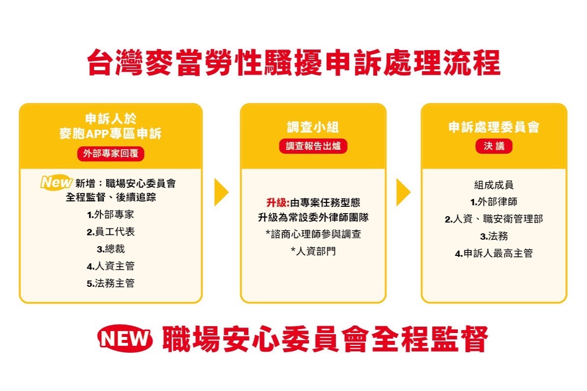 同時列管後續追蹤,並加強對人員的關懷,確保每位在職、離職員工的申訴,都能獲得妥善處理 (若有申訴,可透過員工APP或聯絡 mcdcare@tw.mcd.com ),包括提供必要的心理諮商與法律諮詢服務,避免員工或外界認為公司可能有吃案的疑慮。