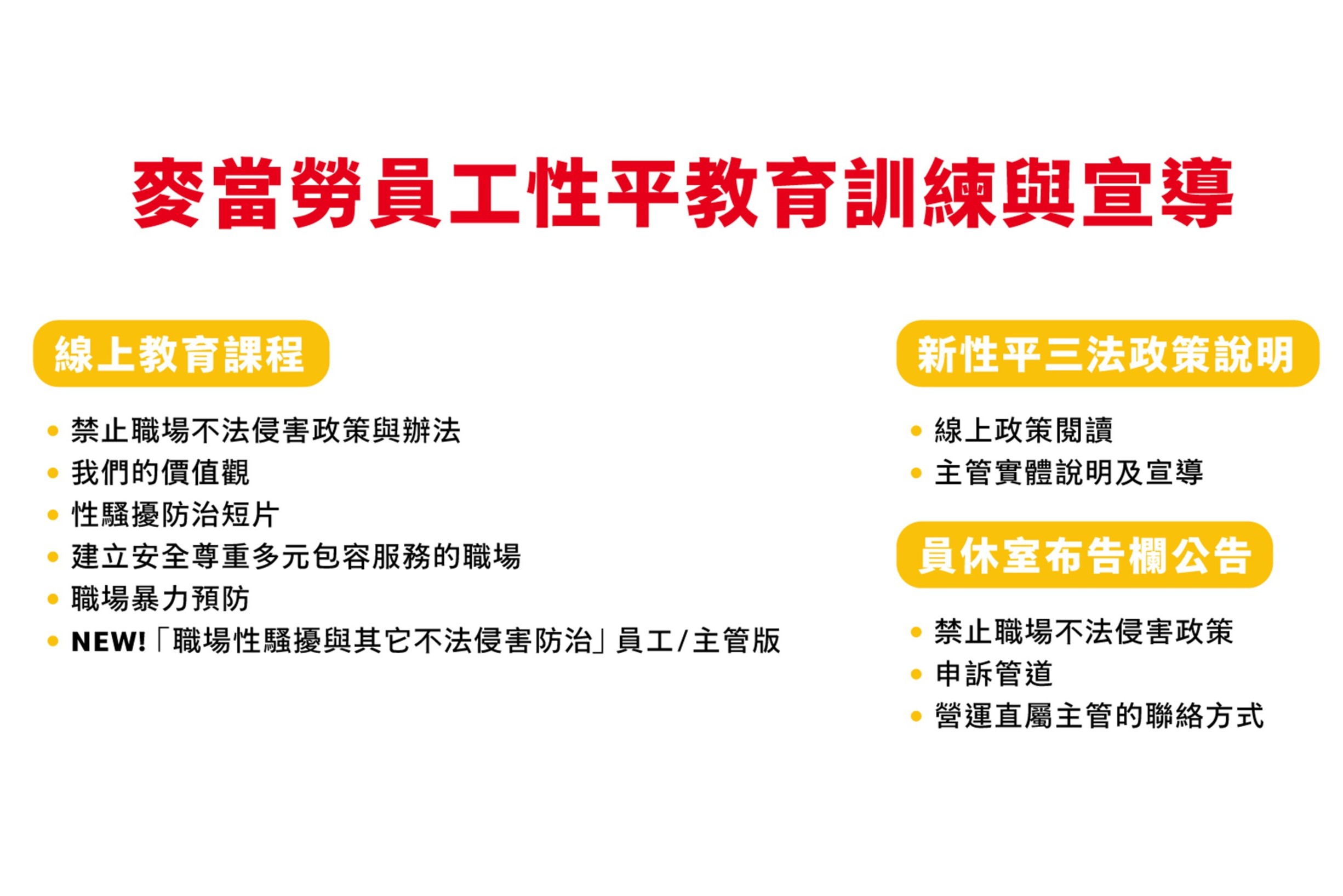 台灣麥當勞依法制定明確的【禁止職場不法侵害政策】,包含了【禁止性騷擾】及【禁止職場暴力】等,同時也鼓勵員工即時發聲並表達想法,提供多元的員工溝通管道。