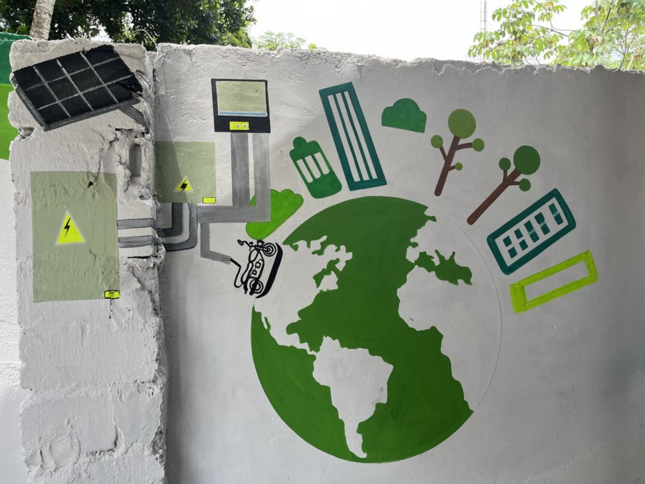 Mingueo 的一幅壁畫描繪了社區的太陽能係統和電動摩托車電池充電站。攝影:Carolina Useche/WRI