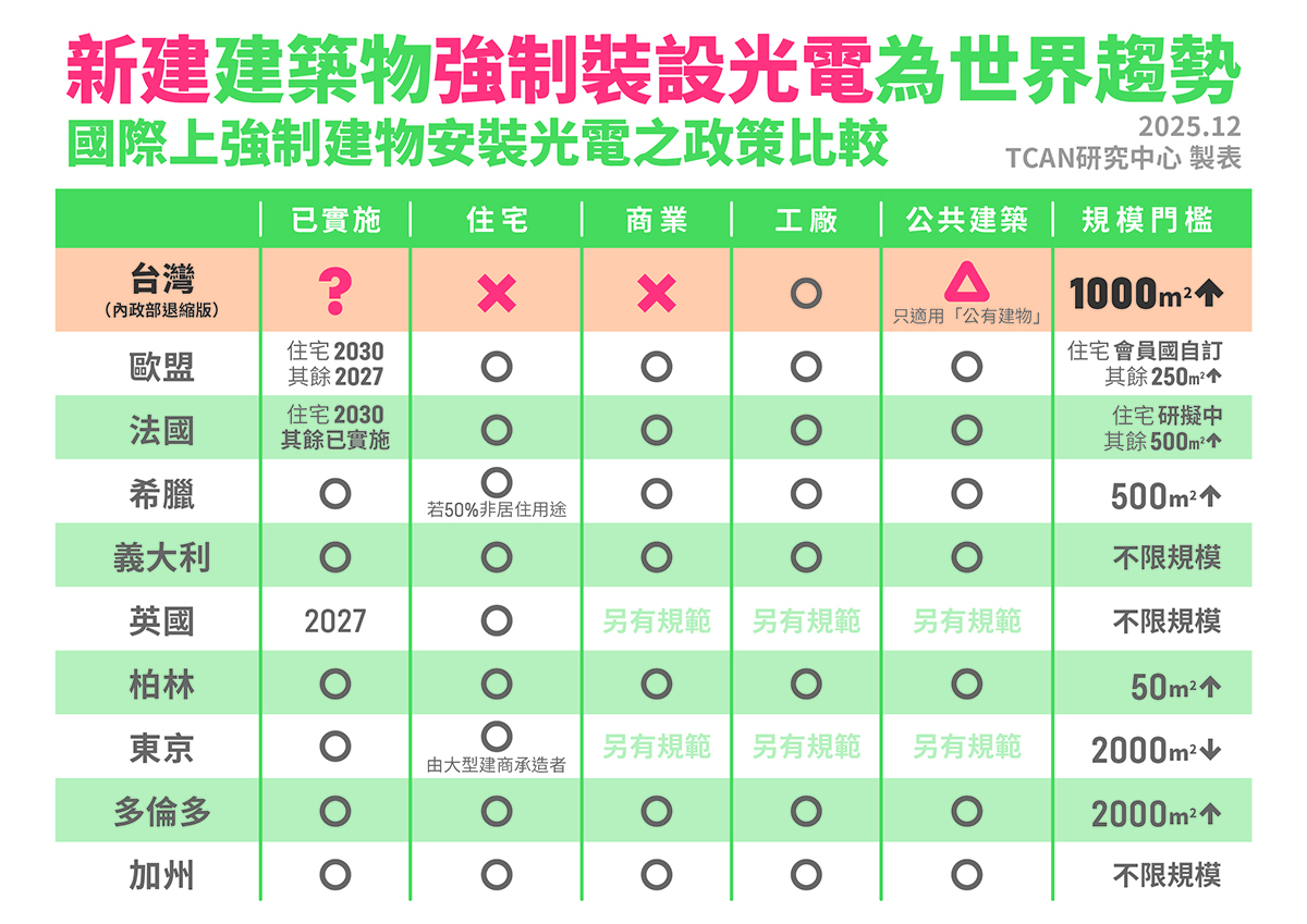 新建建築物強制裝設光電已是世界趨勢,圖為國際上強制建物安裝光電政策比較。圖片來源:地球公民基金會