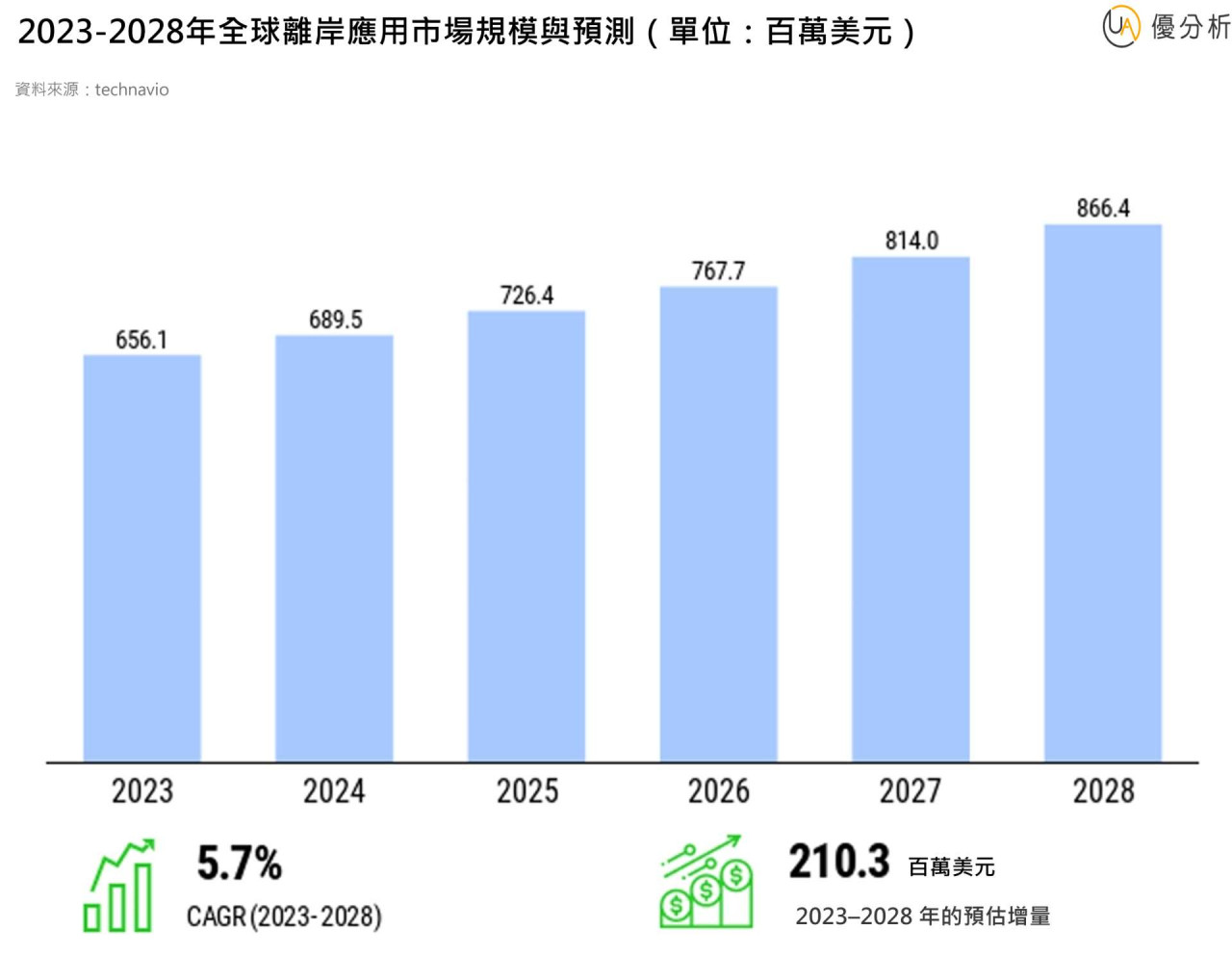 根據 Technavio 研究報告,全球離岸船舶應用市場規模將自 2023 年的 6.56 億美元,成長至 2028 年的 8.66 億美元,年複合成長率達 5.7%。其中,隨著風能需求上升,離岸風機安裝與相關支援船舶、維運作業船(SOV)及海纜鋪設船(CLV)等的需求快速增加。