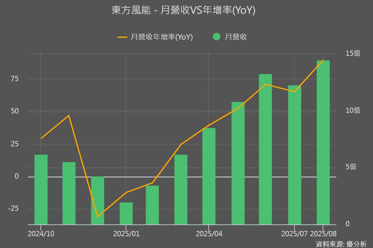 每月營收波動中仍展現整體上升趨勢,主因來自船隊擴張與合約貢獻。市場預估東方風能全年營收與獲利有望再創新高。