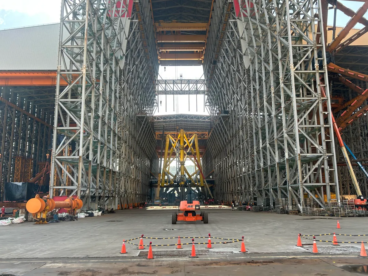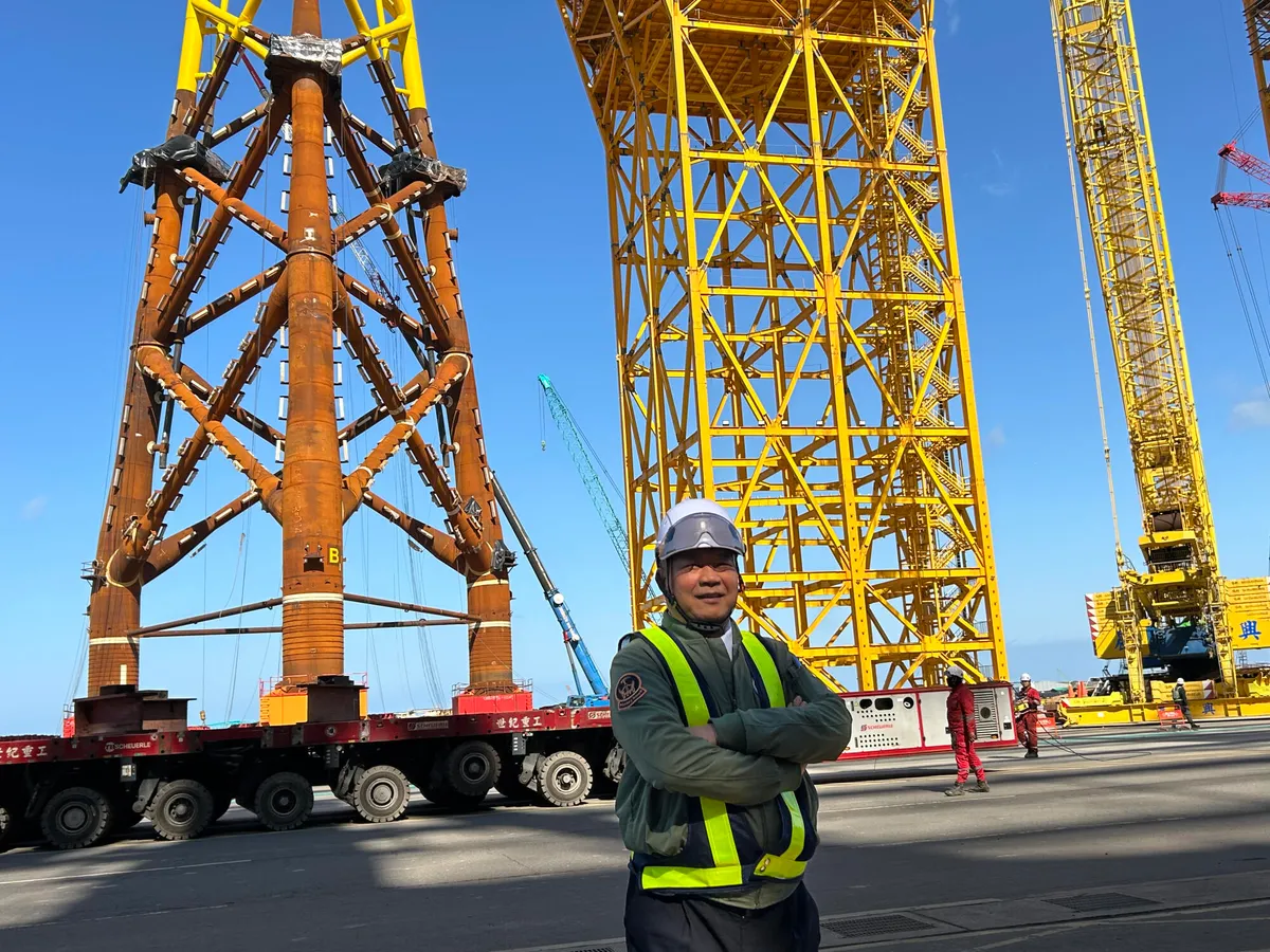 台北港的冬天海風強勁,在世紀鋼的重件碼頭上,巨大的擎天塔吊臂劃過天際,一座座高達三十層樓、重達2500噸的水下基礎聳立於此。