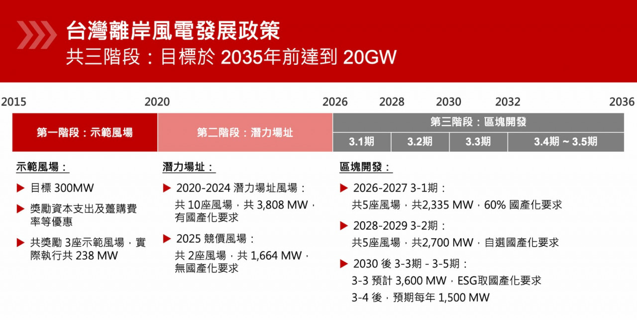 賴文祥表示,世紀風電生產基地設於台北港,具備優越地理位置與港口運輸便利性,水下基礎建設布局完整,為台灣完成最多國產化自製水下基礎的製造商,目前離岸風電區塊開發 3-1 及 3-2 期的國產化政策維持不變,世紀風電可望成為最大受惠廠商,整體風場建置期預計延續至 2029 年。