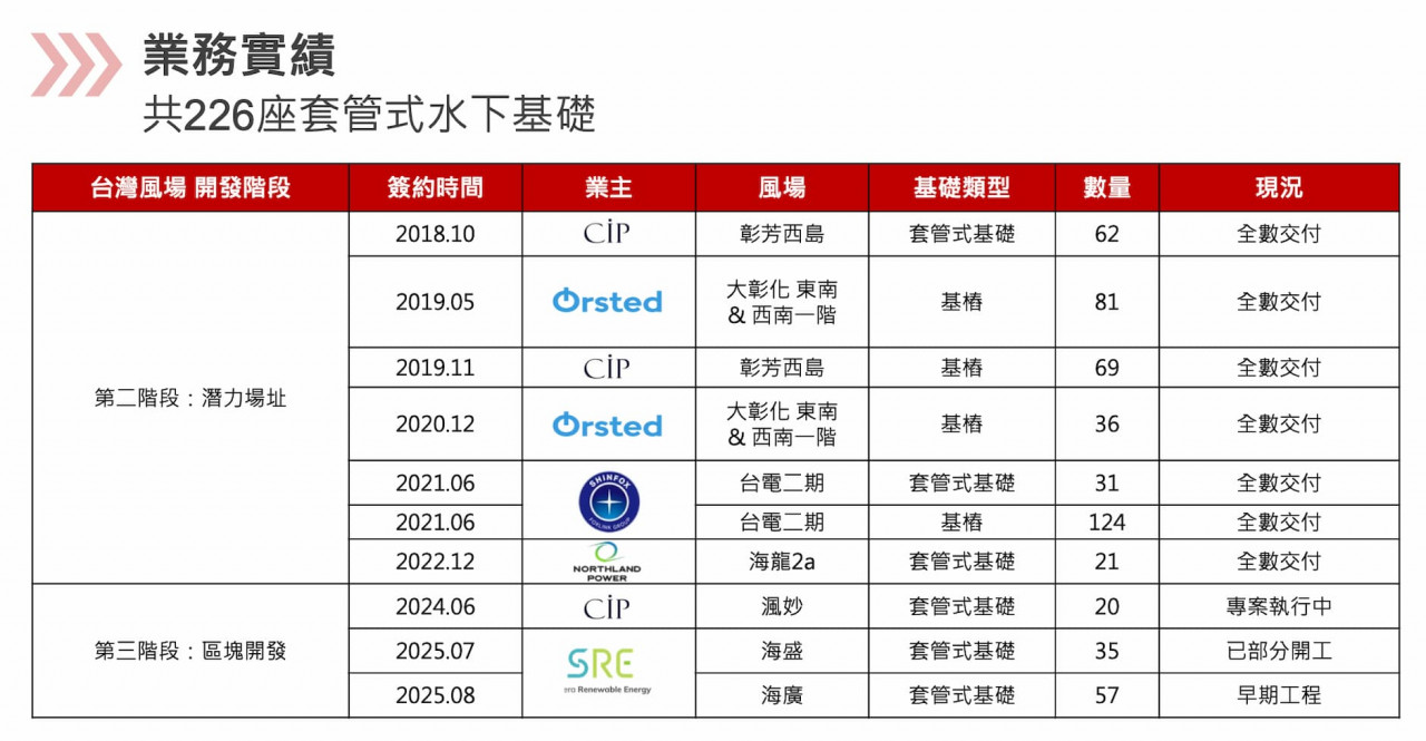 賴文祥分享,世紀風電過去已與 CIP、沃旭、北陸能源、富崴等多家國內外風場開發及營運商合作,近期與風睿能源正式簽署海盛風場及海廣風場套管式水下基礎製造合約,累積關鍵技術實力與豐富工程實績。