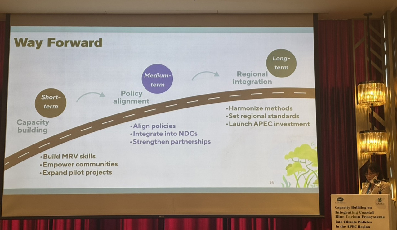 APEC涵蓋不同經濟體,有不同碳定價跟交易模式。李珊瑩表示,為此「亞太區域藍碳政策初步報告」也提出3階段路線圖:短期將聚焦知識共享、先導計畫與完善MRV等基礎能力建構;中期重點放在制度、發展與協調,推動藍碳納入各國 NDC,並提高資金挹注跟社會參與;長期則期盼建立一致的MRV標準與跨經濟體合作機制,開拓投資管道,共同達成淨零目標。