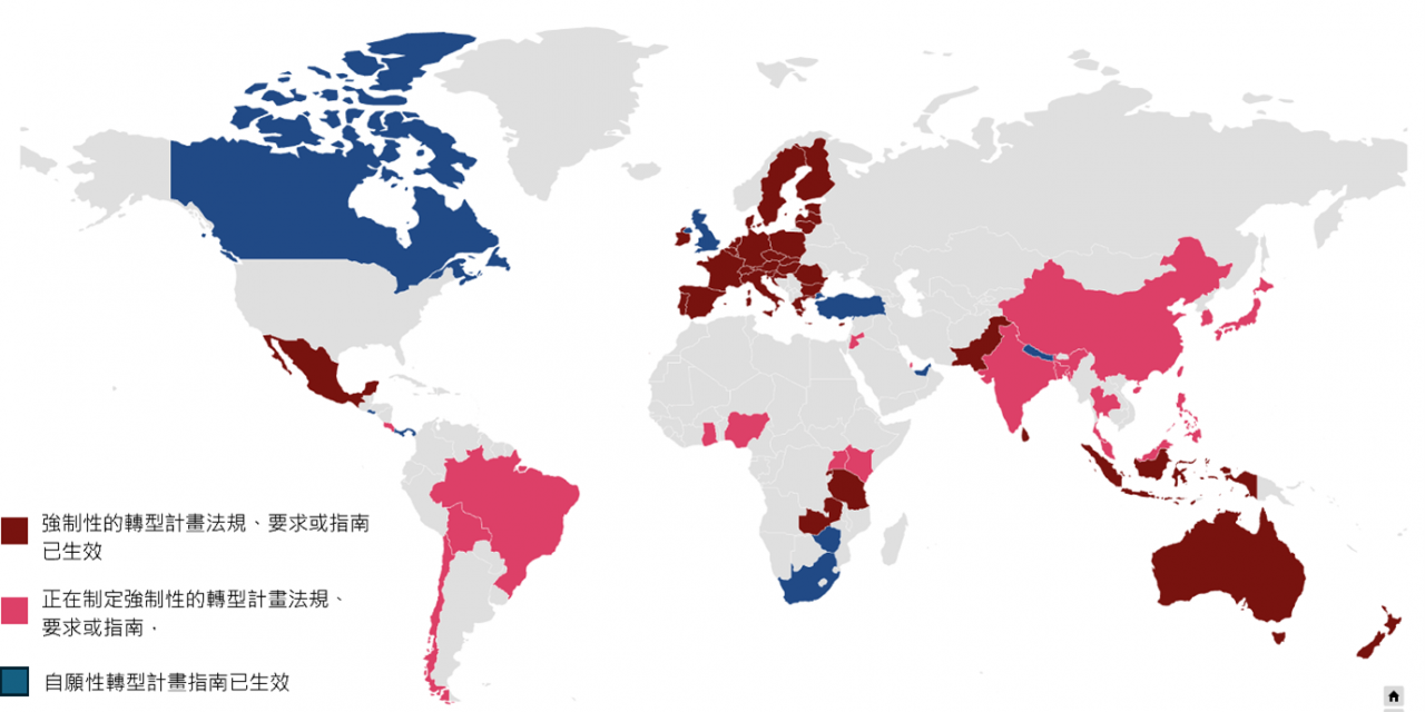 全球各國對轉型計畫的揭露要求。圖片來源: International Transition Plan Network(ITPN) 互動式地圖