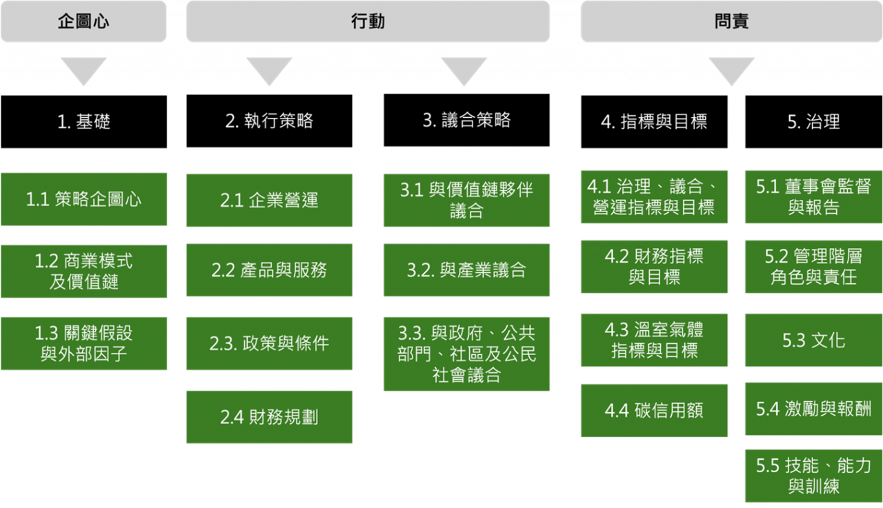 一份完整且可信度高(Credible)的氣候轉型計畫,不僅能協助企業檢視自身的轉型進程,更能提供投資者、客戶與供應商前瞻性的資訊,瞭解該企業在實體與轉型風險的管理能力、公司治理機制與資源配置規劃。