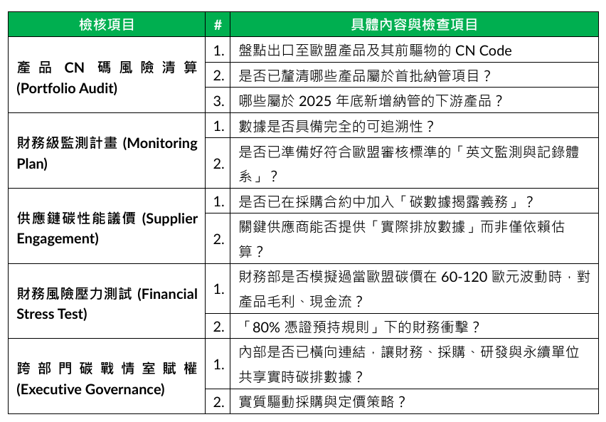 為確保上述三大策略支柱落地,企業組織需要一套可操作的檢核清單,以逐項核對產品、供應鏈、財務與跨部門協作的準備程度。以下分享我們顧問的 CBAM 檢核表,可作為企業自我評估與優先行動的工具: