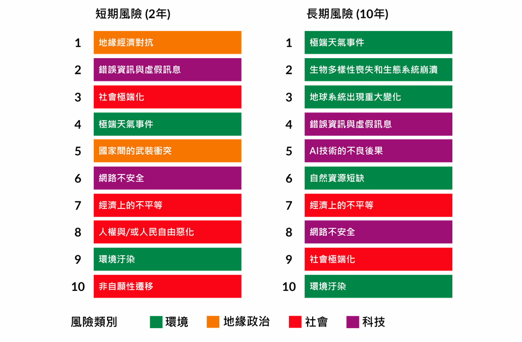 報告描繪了一個由地緣政治與地緣經濟對立、社會分化加劇,以及科技與氣候長期壓力共同形塑的世界。風險不再以單點事件出現,而是以系統性衝擊的方式,同時影響國家安全、企業營運與社會穩定。