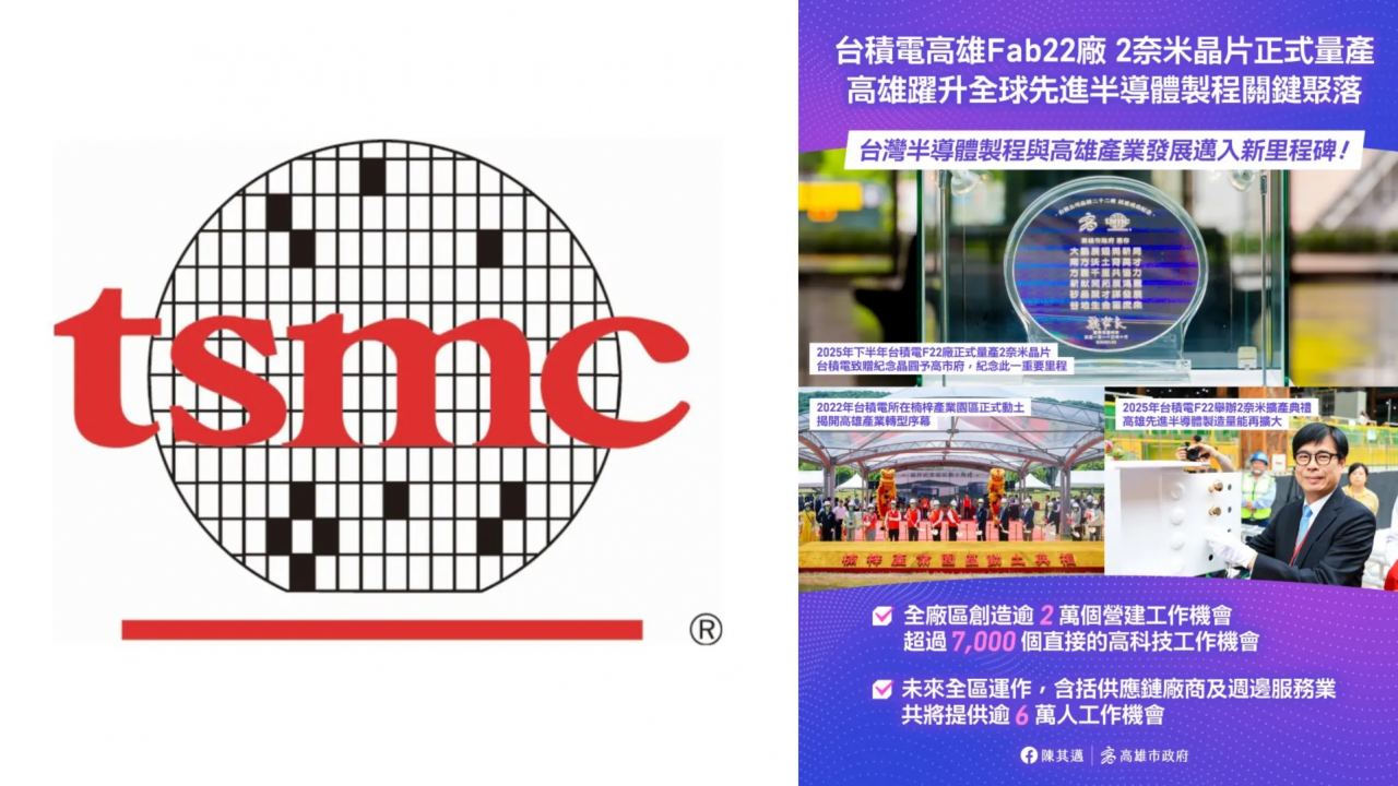 1月初,台積電於官網更新資訊,宣布高雄Fab22廠的2奈米製程正式進入量產階段,確認製程依既定時程推進;隨後,高雄市長陳其邁也在臉書分享這項進展,相關消息迅速在網路上擴散,也讓高雄再次被點名為全球先進半導體製程的重要據點。