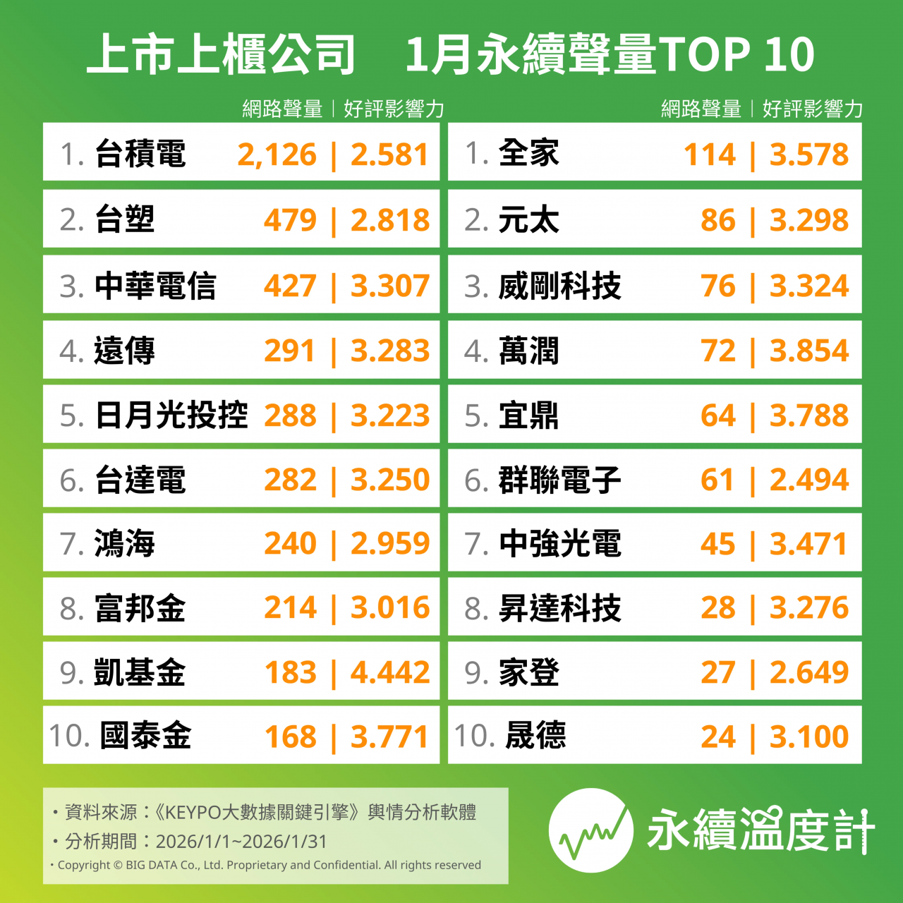 《網路溫度計DailyView》以2026年1月30日台灣期貨交易所公布的市值前50大上市上櫃公司、且落實永續行為的公司為依據,透過輿情分析軟體《KEYPO大數據關鍵引擎》,分析2026年1月1日至1月31日期間的企業永續聲量排名。聲量高低之外,哪些行動真正留下好評、被反覆提起,成為1月榜單最值得觀察的變化。