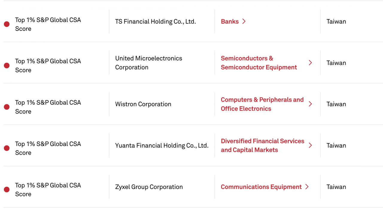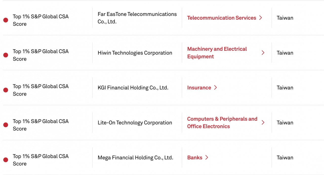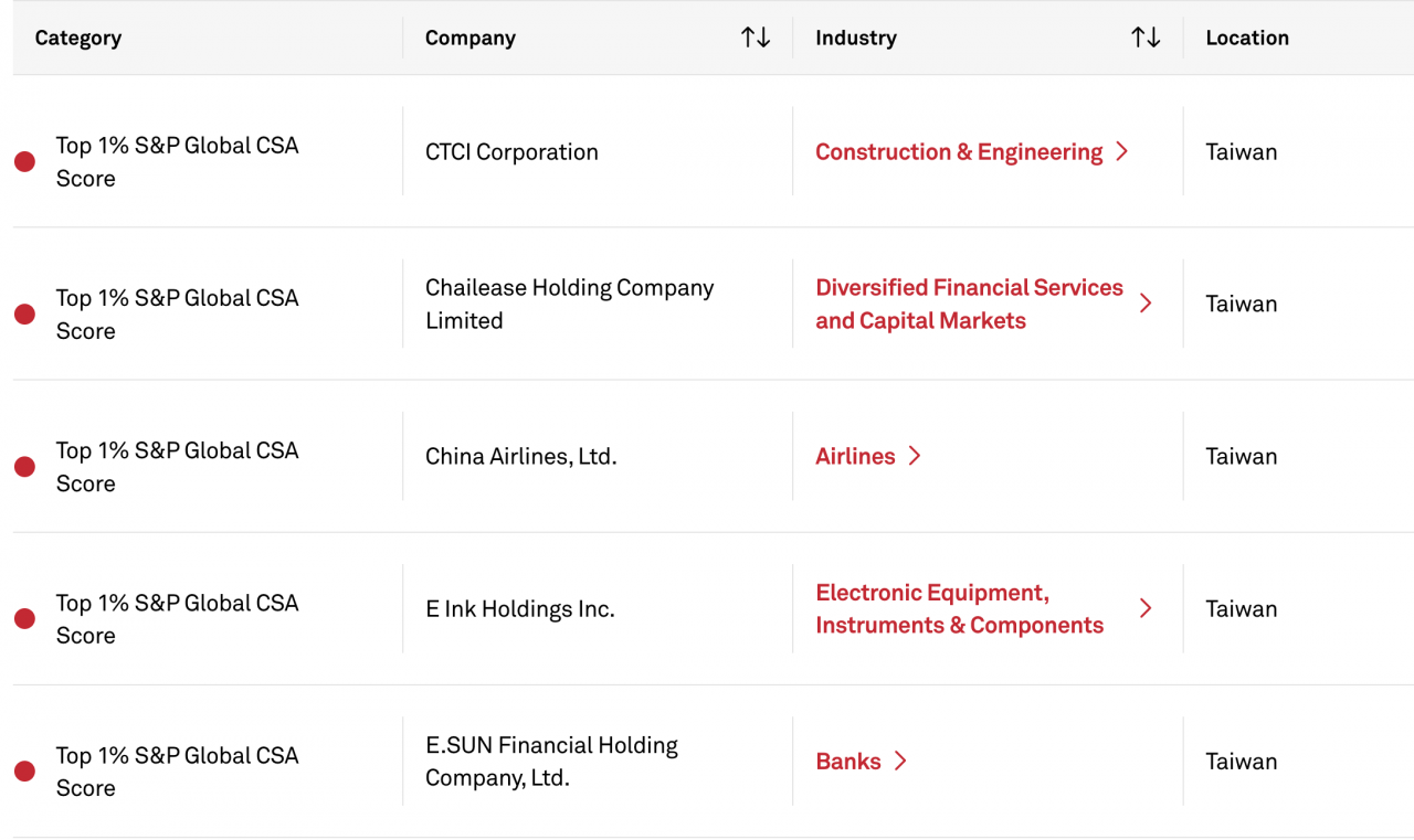 此外,標普全球也依企業在各自產業中的相對表現,進一步評選出Top 1%、Top 5%與Top 10%企業,以突顯各產業中永續表現最突出的標竿。