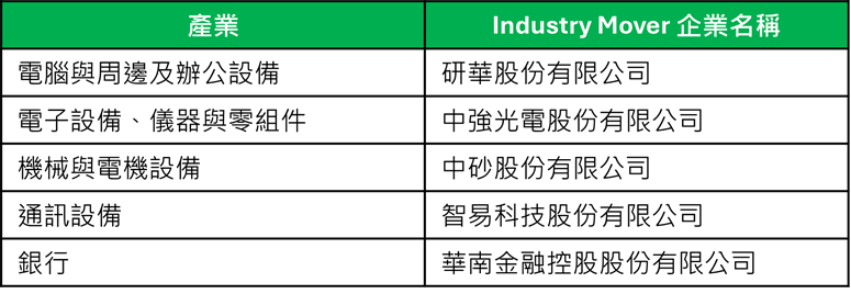 此外,年鑑中亦列出「產業進步獎(Industry Mover)」企業,代表其在年度評比中出現較顯著的分數提升。