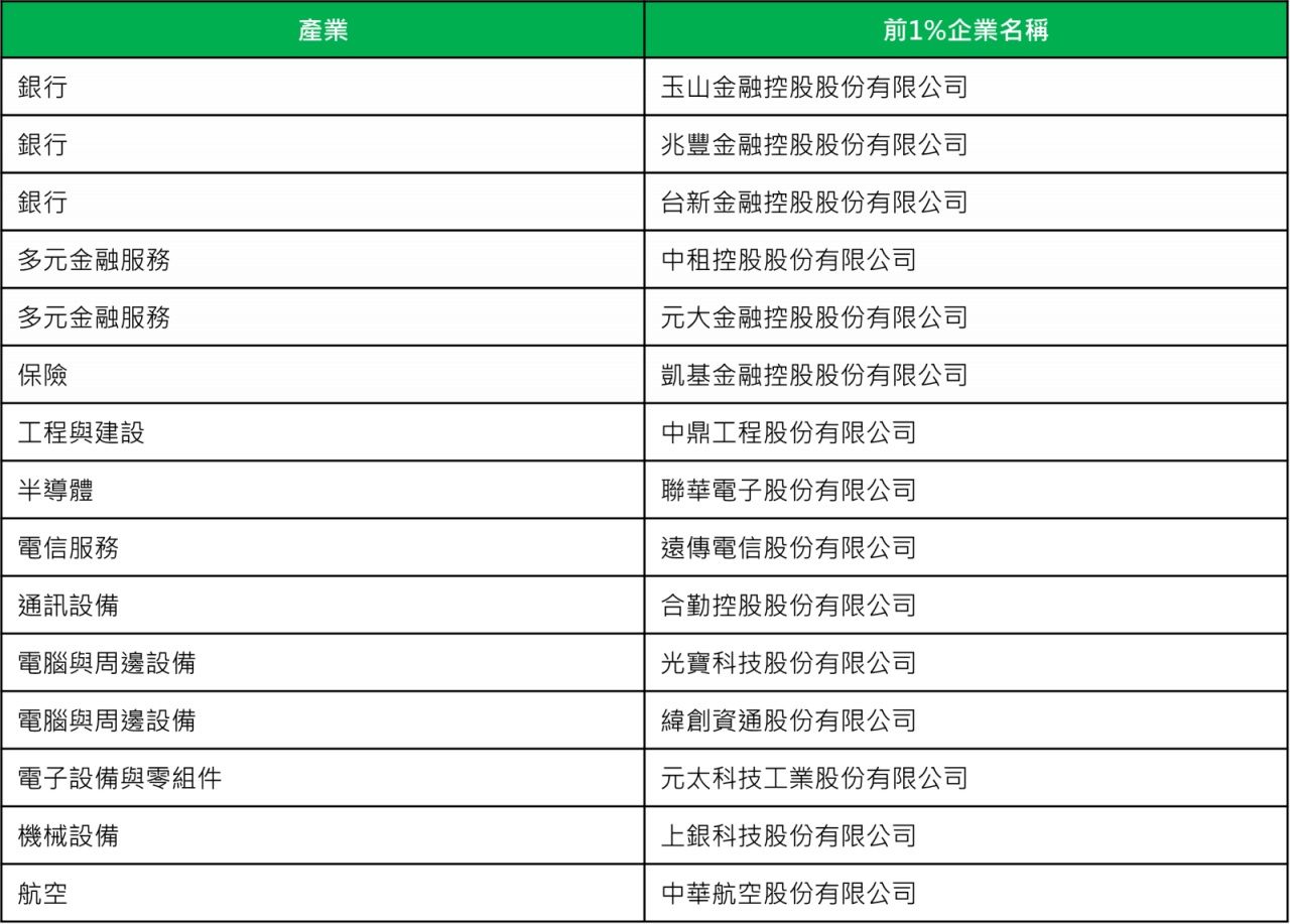 從本次年鑑的產業分布來看,金融業為主要的高分群來源,不僅在 Top 1% 中占有多席,也廣泛分布於 Top 5% 與 Top 10% 名單;整體入選企業數量則維持穩定,並有部分企業進入較高排名區間。
