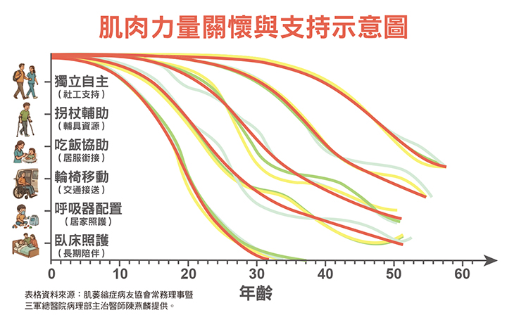「肌萎縮症目前沒有治癒方式,只能延緩功能喪失。對於病友來說,就是每天都在惡化,卻不知道明天我又會無法做什麼?」陳燕麟說道。然而,雖然肌萎縮症發病原因各異,病程模式卻大同小異,皆為肌力逐漸下降,只是速度不同而已。也因此,若能建立病程大數據及發展曲線,病友及照顧者便能提前準備所需資源,也降低心理衝擊。