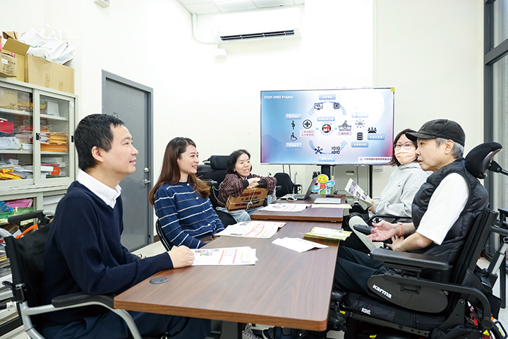 陳燕麟醫師(圖左)帶領肌萎縮症病友及核心團隊共同討論,透過病程數據的系統化呈現,更快讓病友掌握身體變化,讓未來不再是模糊恐懼,而是能提早準備面對人生的下個階段。(圖片來源:今周刊拍攝)